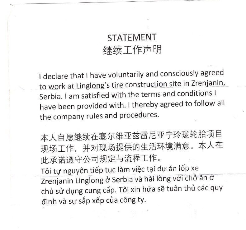 Obavezivali su se radnici i da će snositi odgovornost za sve troškove ukoliko iz zdravstvenih razloga budu morali da se vrate u Vijetnam pre isteka ugovora i da neće tužiti kompaniju zbog toga.