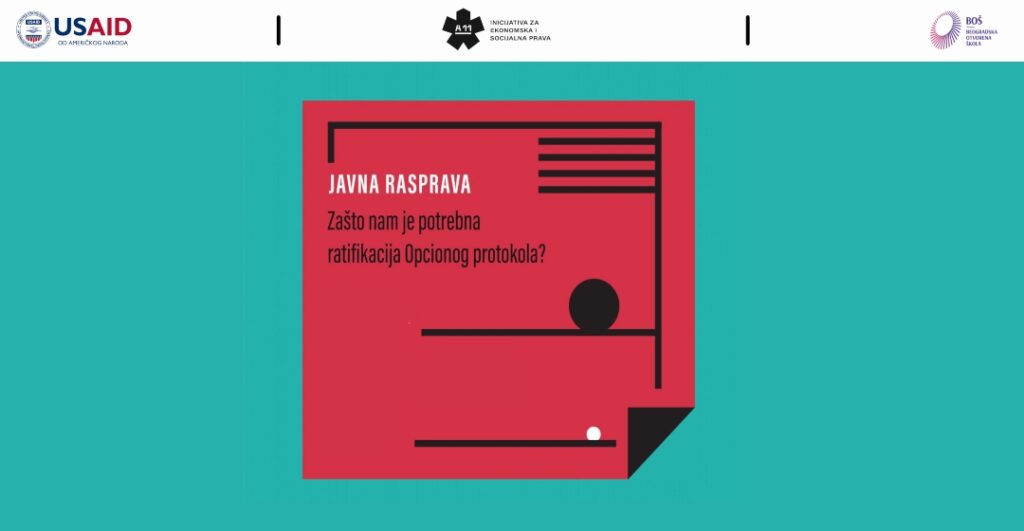 On October 20, 2021, Initiative A 11, with the support of the United States Agency for International Development (USAID) and the Belgrade Open School (BOŠ), opened a public debate on barriers to enjoying economic and social rights in Serbia, as well as opportunities and the benefits of signing and ratifying the Optional Protocol to the International Covenant on Economic, Social and Cultural Rights.