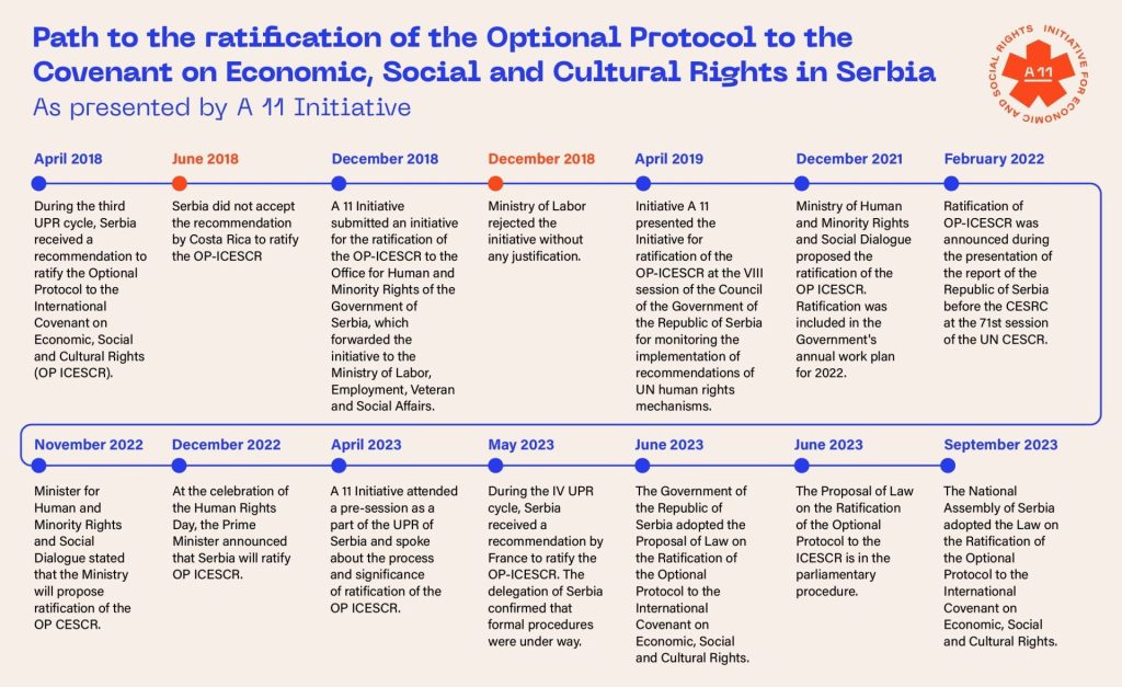 Međutim, put ka ovoj važnoj prekretnici u zaštiti socioekonomskih prava u Srbiji bio je dug i otežan preprekama. U aprilu 2018. godine, tokom trećeg ciklusa Univerzalnog periodičnog pregleda (UPR) za Srbiju, Srbija nije prihvatila preporuku da ratifikuje Opcioni protokol, o čemu je Inicijativa A 11 obavestila javnost i pokrenula proces zagovaranja za ratifikaciju Opcionog protokola, koji se sastojao od niza komplementarnih aktivnosti usmerenih na državne organe (kroz sastanke, javne debate, inicijative i, indirektno, podnošenjem alternativnih izveštaja UN mehanizmima za zaštitu ljudskih prava), medije (kroz brojna saopštenja), i na opštu javnost (kroz video-materijale i kombinaciju informativnih i participativnih aktivnosti usmerenih na građane).